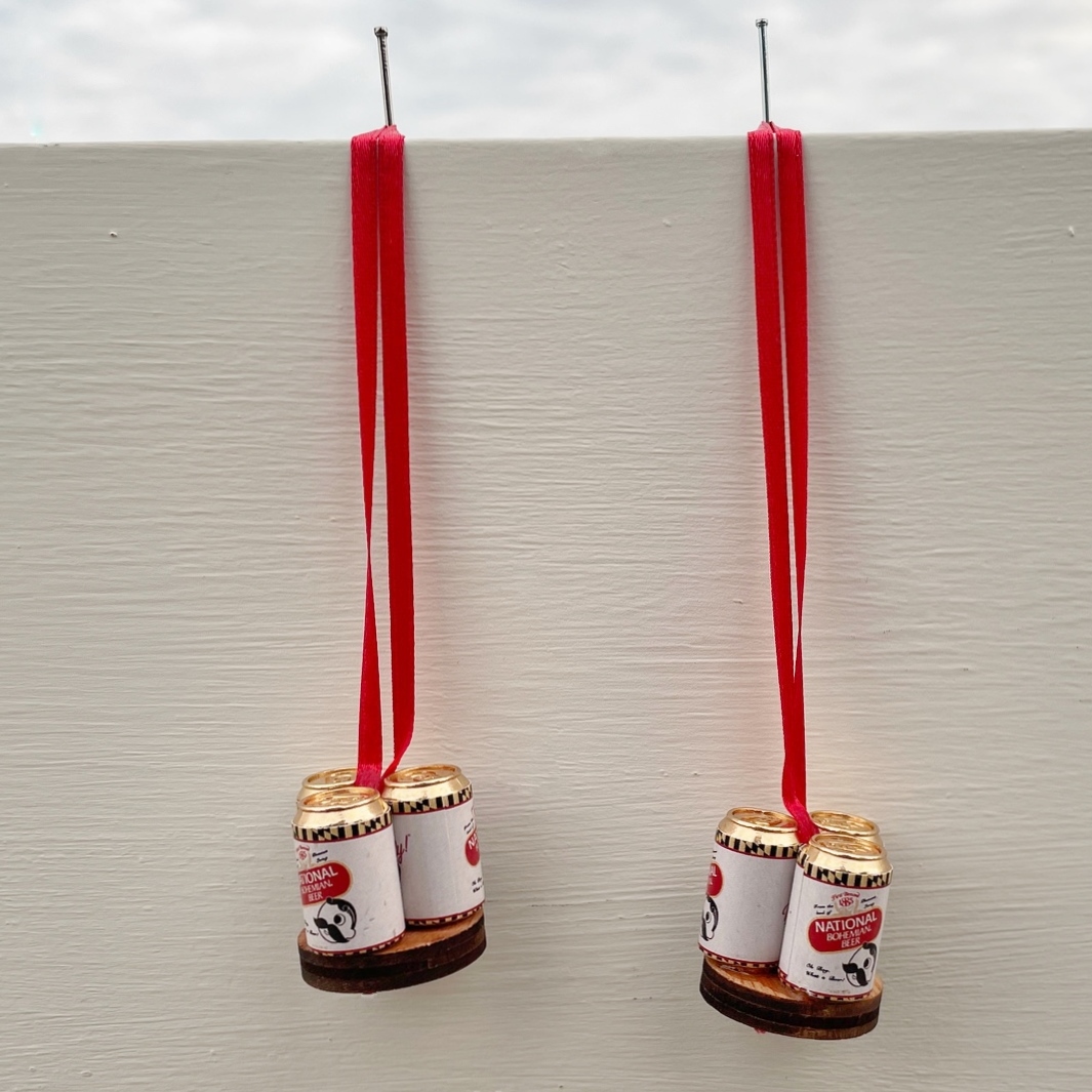4. Natty Boh Beer: 3-pack, cans are .75” high X .50” dia. (no beer inside), on circular wooden platform, crabs go better with National Bohemian beer!