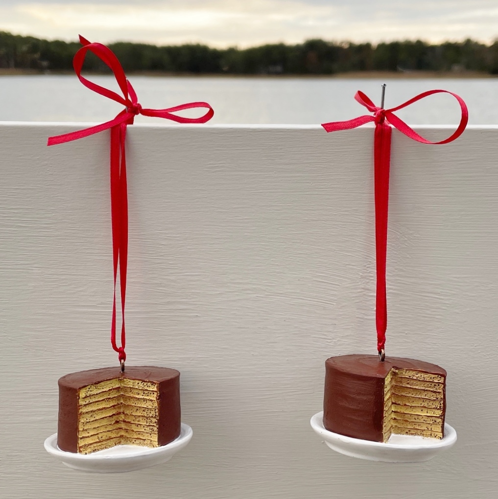 5. Smith Island Cake: Official state dessert of Maryland, chocolate icing & yellow cake, on white plate, cast polyresin (inedible), hand painted, 1” high X 1.80” dia.