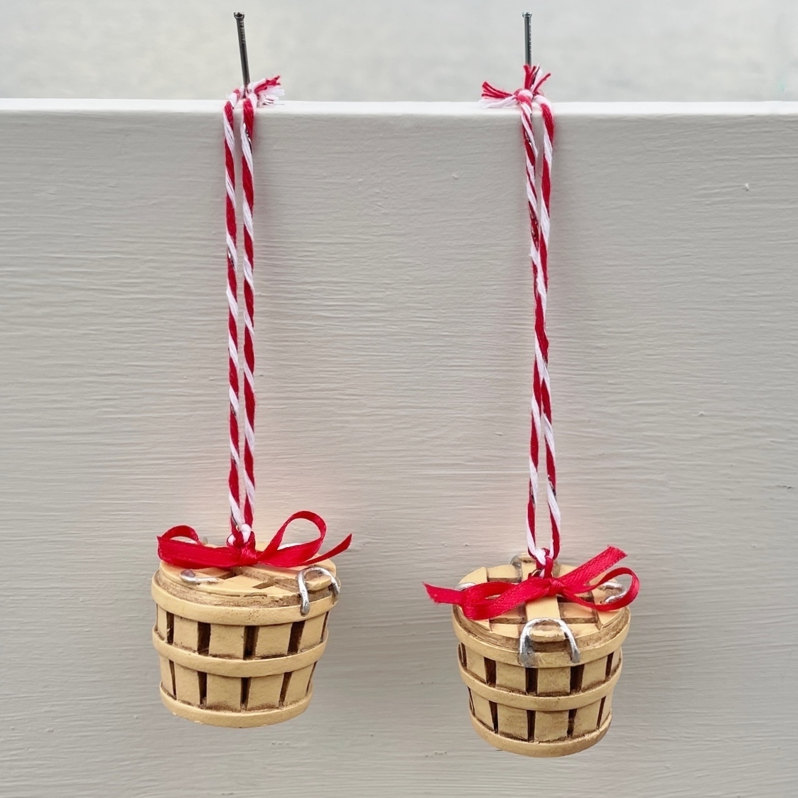 6. Bushel Basket, with Attached Lid: Cast polyresin, hand painted, 1.20” high X1.38" dia.