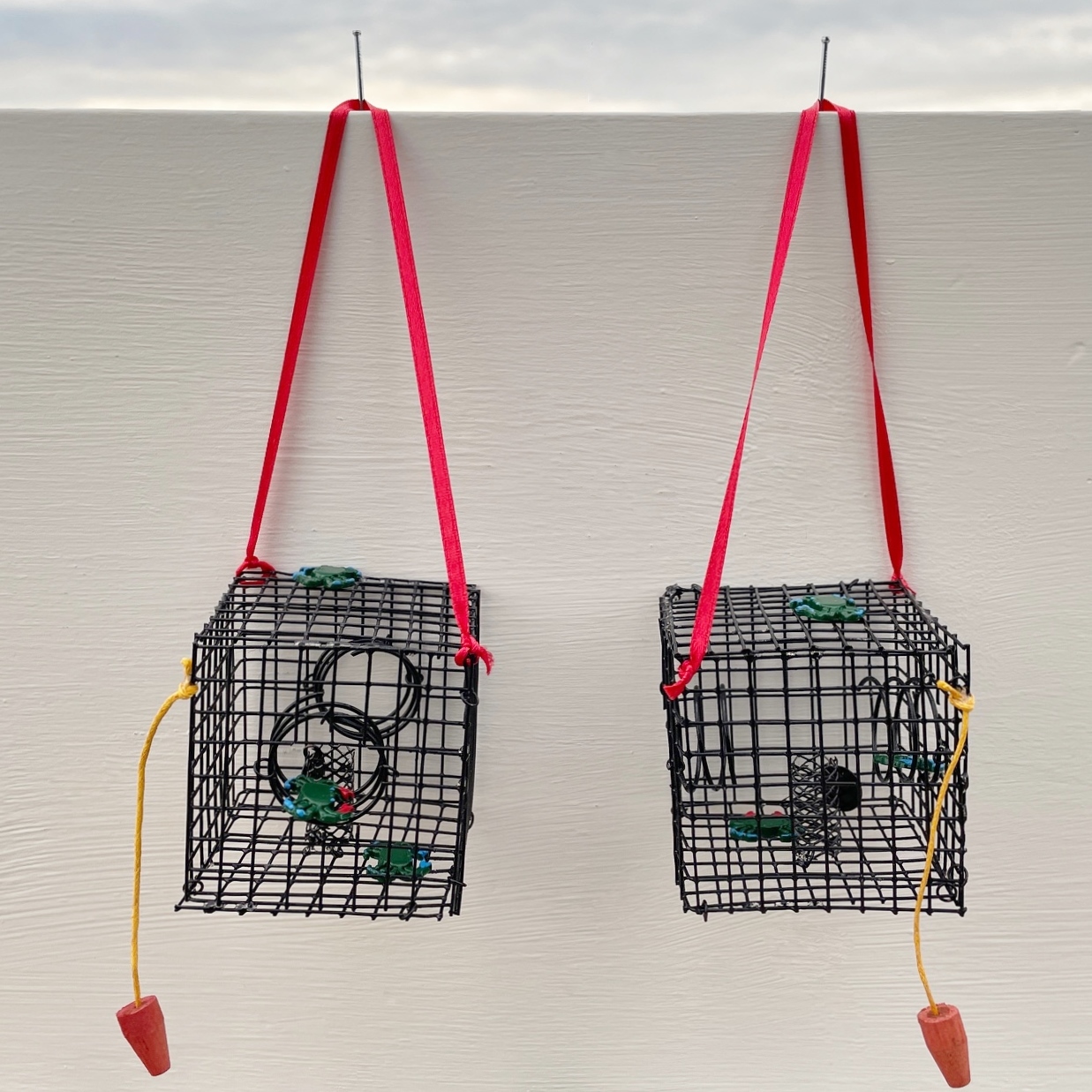 8. Crab Trap with Crabs: Black wire construction, 2” X 2” X 2”, with float on rope, bait cage, two crab entrances and three hand painted crabs